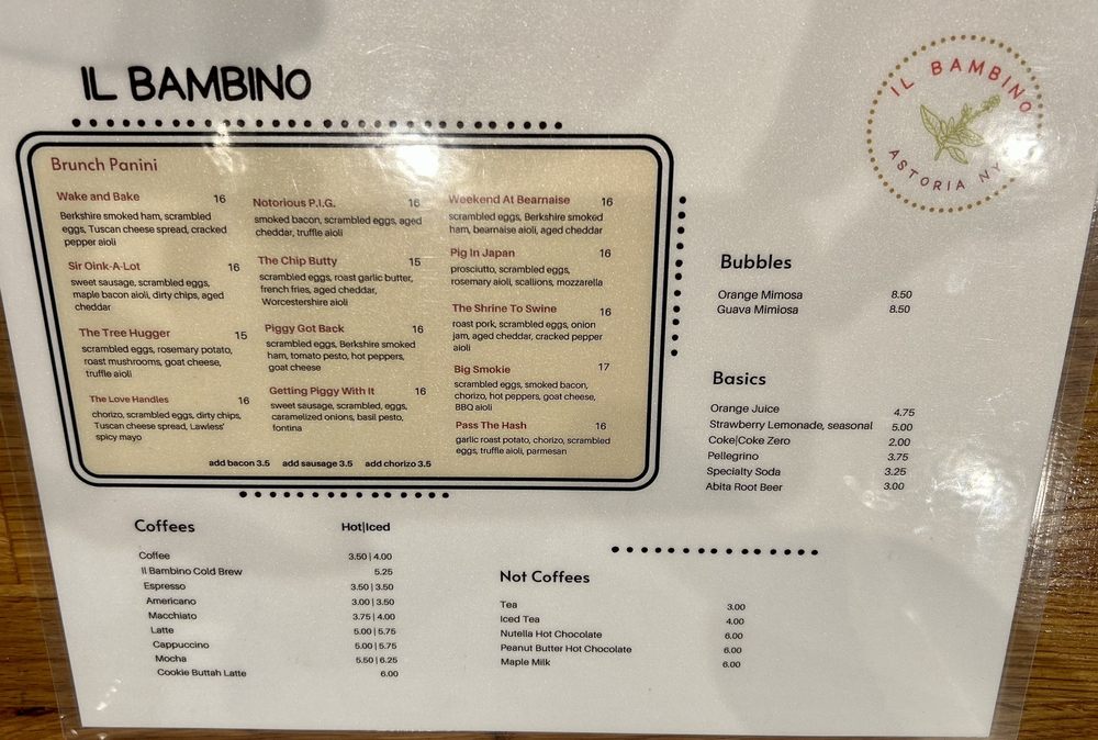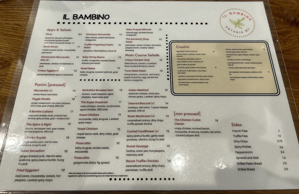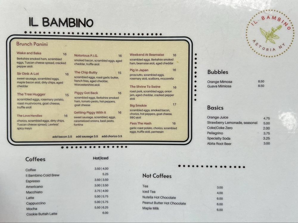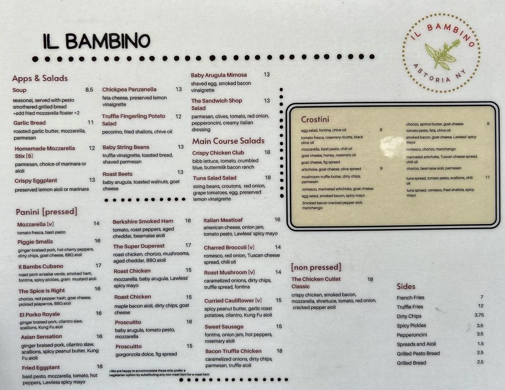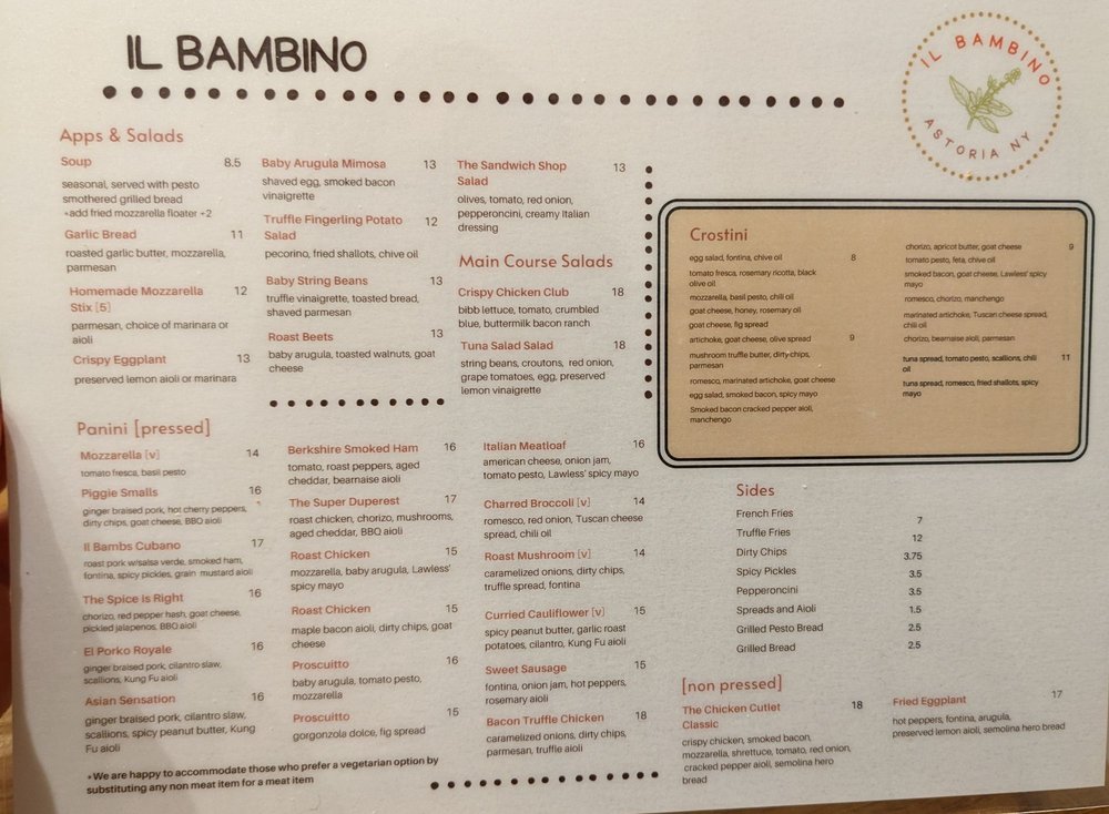 Introducing Il Bambino, a hidden gem in Astoria, NY. Specializing in paninis, crostinis, and soups, this tapas bar offers a unique and flavorful menu. Customers rave about the perfectly toasted paninis and exceptional crostinis. The Brunch Panini selection is a standout, with creative combinations like The Breakfast Special and Piggy Got Back. The cozy atmosphere and top-tier ingredients create a delightful dining experience. The menu also includes appetizers like truffle parmesan fries and crispy hash browns, catering to various tastes. Reviewers commend the friendly staff, great service, and welcoming ambiance. Il Bambino is a must-visit for those seeking quality food and a charming atmosphere in Astoria.